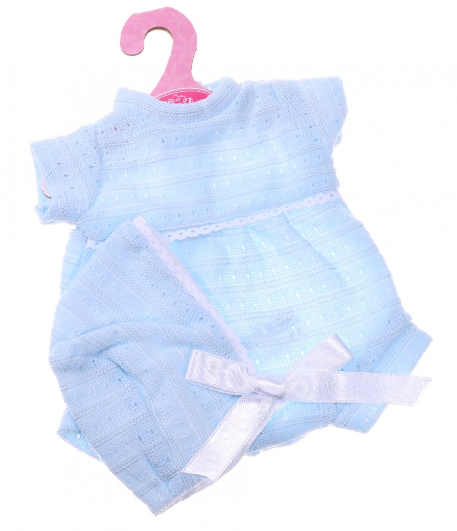 Niebieskie body z czapeczką to propozycja od marki Antonio Juan do garderoby lalki o wysokości 33 cm. W skład kompletu wchodzą zapinane na rzepę body z krótkim rękawkiem oraz wiązana pod brodą czapeczka. Oba elementy stroju zostały wykonane z dzianiny w błękitnym odcieniu dodatkowo ozdobionej koronkową wstawką.