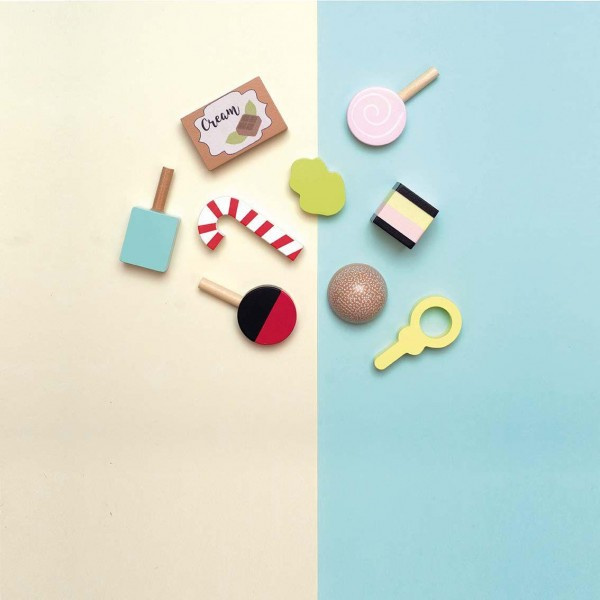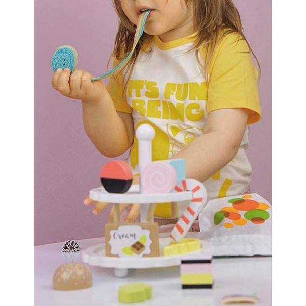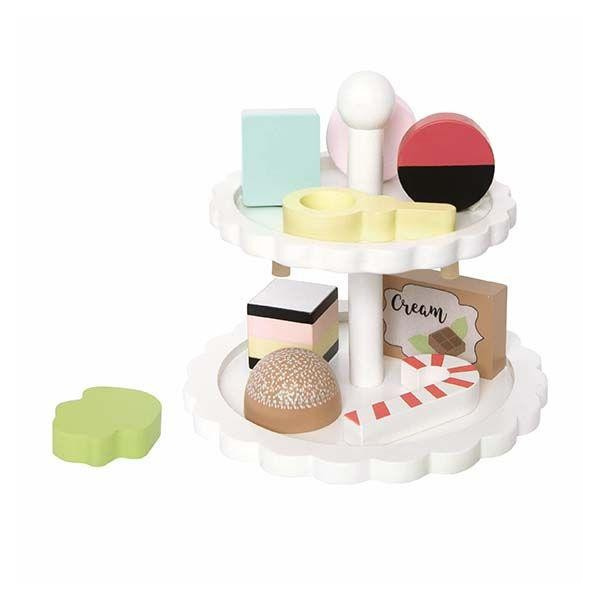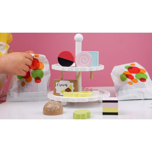Piękna drewniana dwupoziomowa patera marki Jabadabado z uroczymi słodkościami w stylu retro, to nowość 2020. W zestawie znajduje się dziewięć słodkości każdy pięknie wykonany, w uroczej żywej kolorystyce, idealnie komponuje się z pudełkiem z lodami również w stylu retro.
