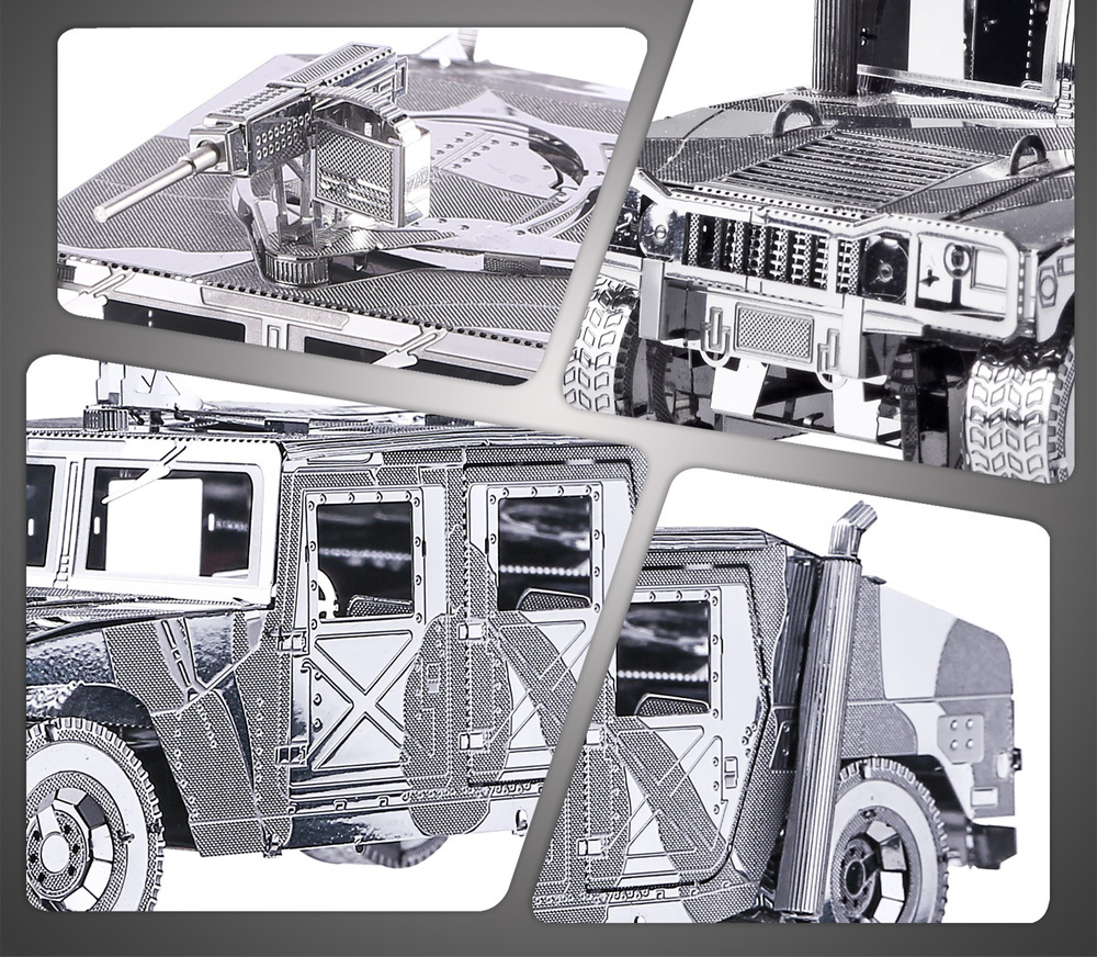 Od 1984 r. zbudowano i wdrożono do służby wojskowej ponad 250 000 pojazdów HMMWV – aka „Humvee”. Model Humvee firmy Piececool odtwarza klasyczną konfigurację z czasów wojny w Zatoce Perskiej, dzięki której stał się sławny na całym świecie. Gotowy model ma wymiary 9,5 x 4,5 x 5 cm i składa się z 78 elementów, wypełnionych szczegółami stworzonymi w naszym unikalnym procesie trawienia.