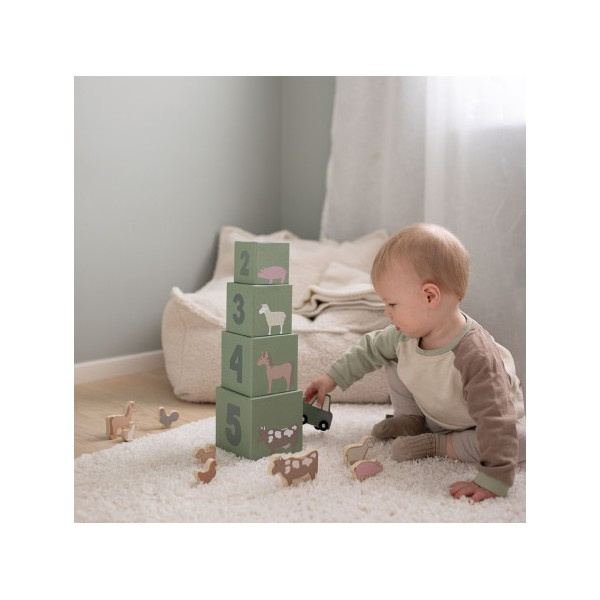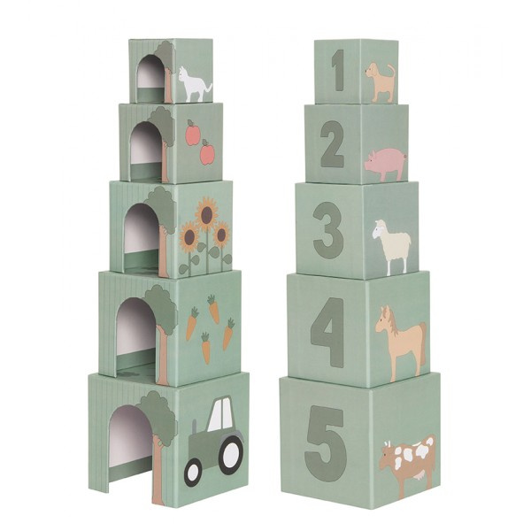 Każda kostka piramidy ozdobiony jest cyfrą od 1 do 5 oraz uroczymi motywami zwierząt gospodarskich. W każdej z kostek znajdują się zwierzątka, które można przemieszczać, tworząc dla nich małe domki. W zestawie znajdują się krowa, koń, świnia, owieczka, pies oraz kot, kogut, kura, co pozwala dzieciom na naukę o zwierzętach w sposób zabawny i interaktywny.