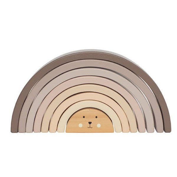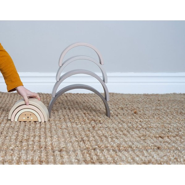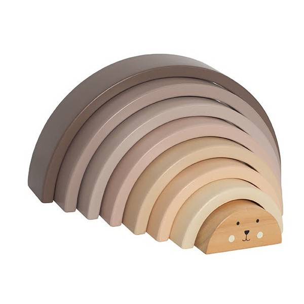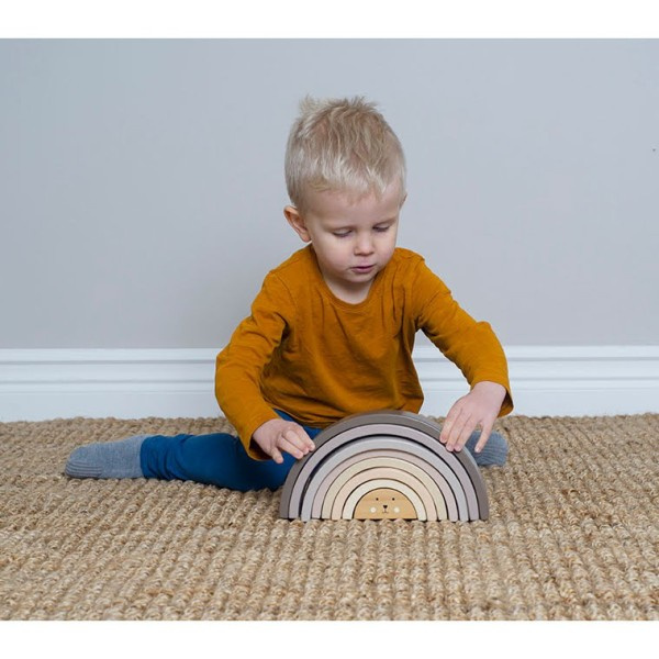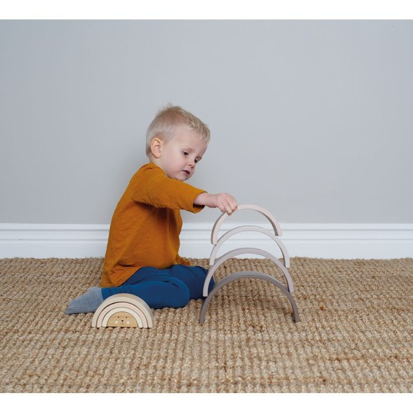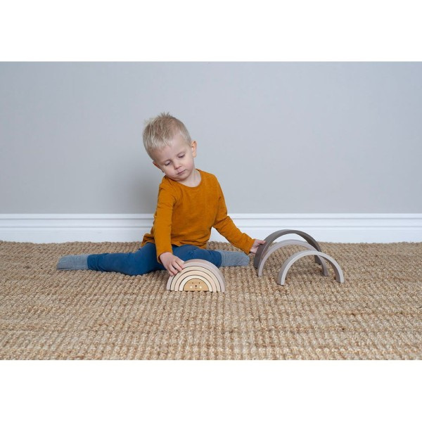 Piramida tęcza w uroczych naturalnych kolorach ziemi. Idealna zabawka drewniana pobudzająca kreatywność zarówno dla najmłodszych fanów konstruowania, jak i trochę starszych. Skłąda się z ośmiu krążków w różnych odcieniach kolorystycznych i różnej wielkości.