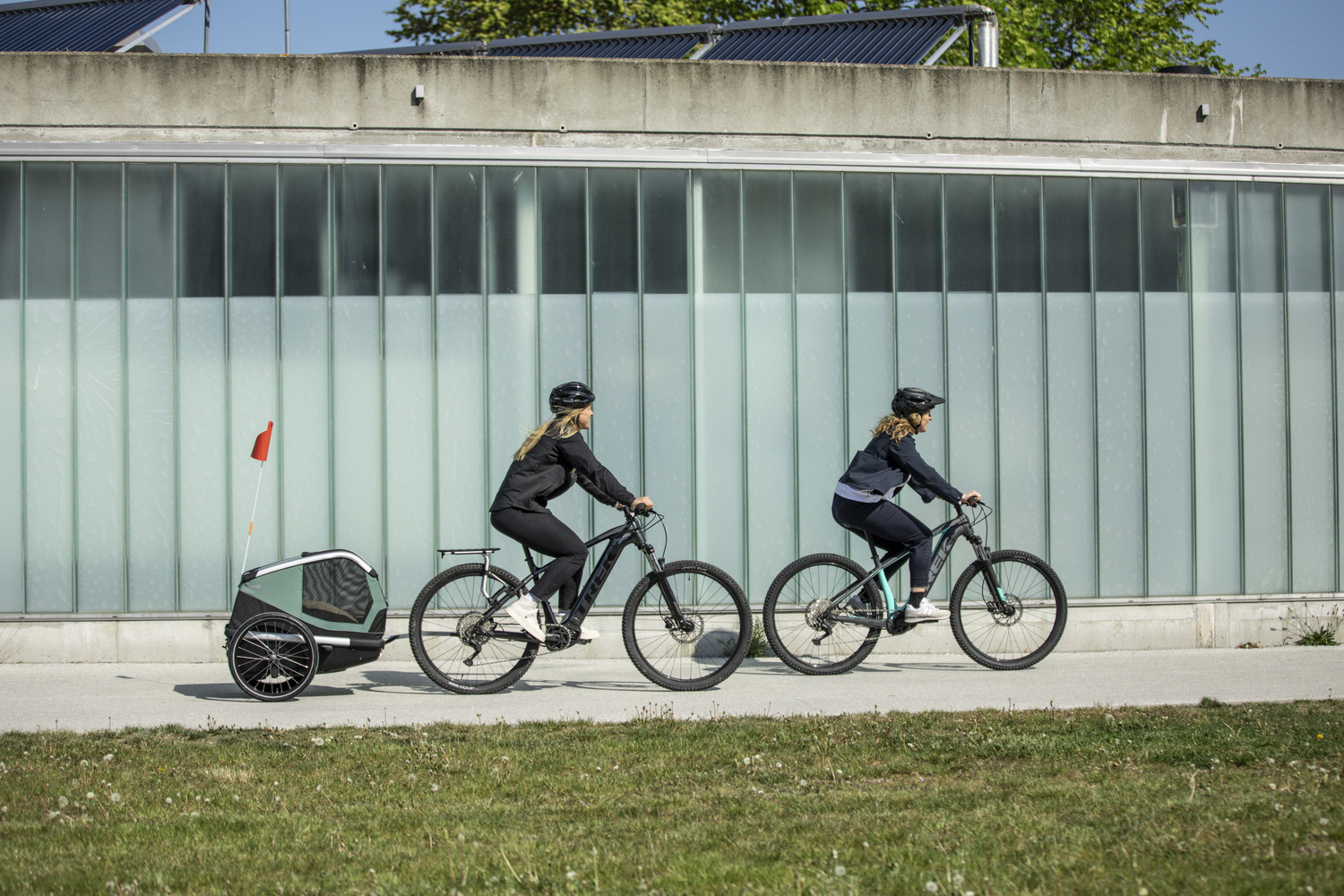 - W zestawie z przyczepką dyszel do podpięcia do roweru oraz flaga, której zadaniem jest zwiększenie widoczności przyczepki na drodze, ścieżce rowerowej.