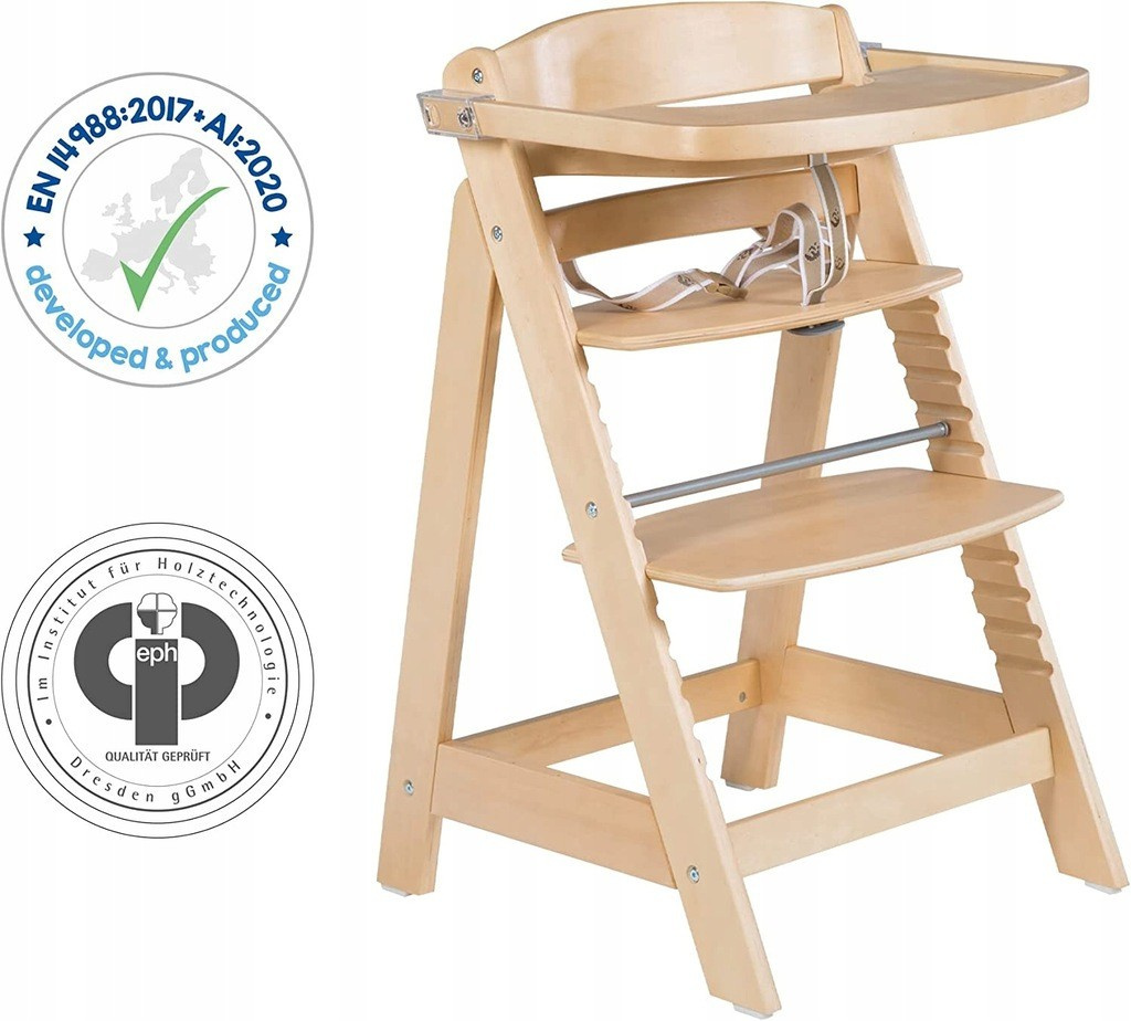 Wysokość i głębokość siedziska i podnóżka można regulować w zależności od fazy wzrostu i zapewnienia optymalnego podparcia pleców w celu ergonomicznego ustawienia siedziska. Wysokie krzesełko charakteryzuje się dużą odpornością na przechyły, wyjmowanymi barierkami bezpieczeństwa oraz bezpiecznym systemem uprzęży. Zdejmowany pałąk bezpieczeństwa i system pasów zapewniają dodatkową ochronę w okresie niemowlęcym. Ponadto idealnie nadaje się do różnych wysokości stołu ze względu na możliwość regulacji. Krzesełko Roba jest odpowiednie dla dzieci od ok. 6 miesięcy, a jego maksymalne obciążenie to ok. 50 kg.