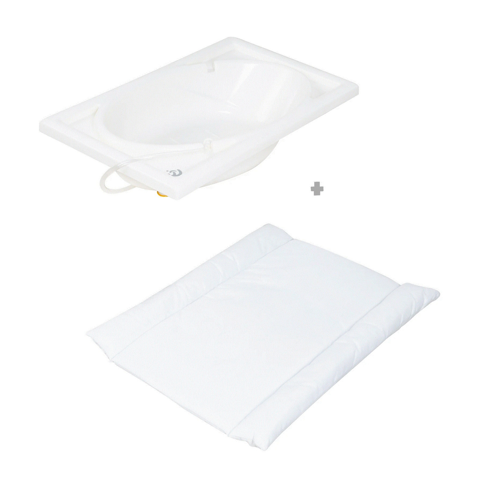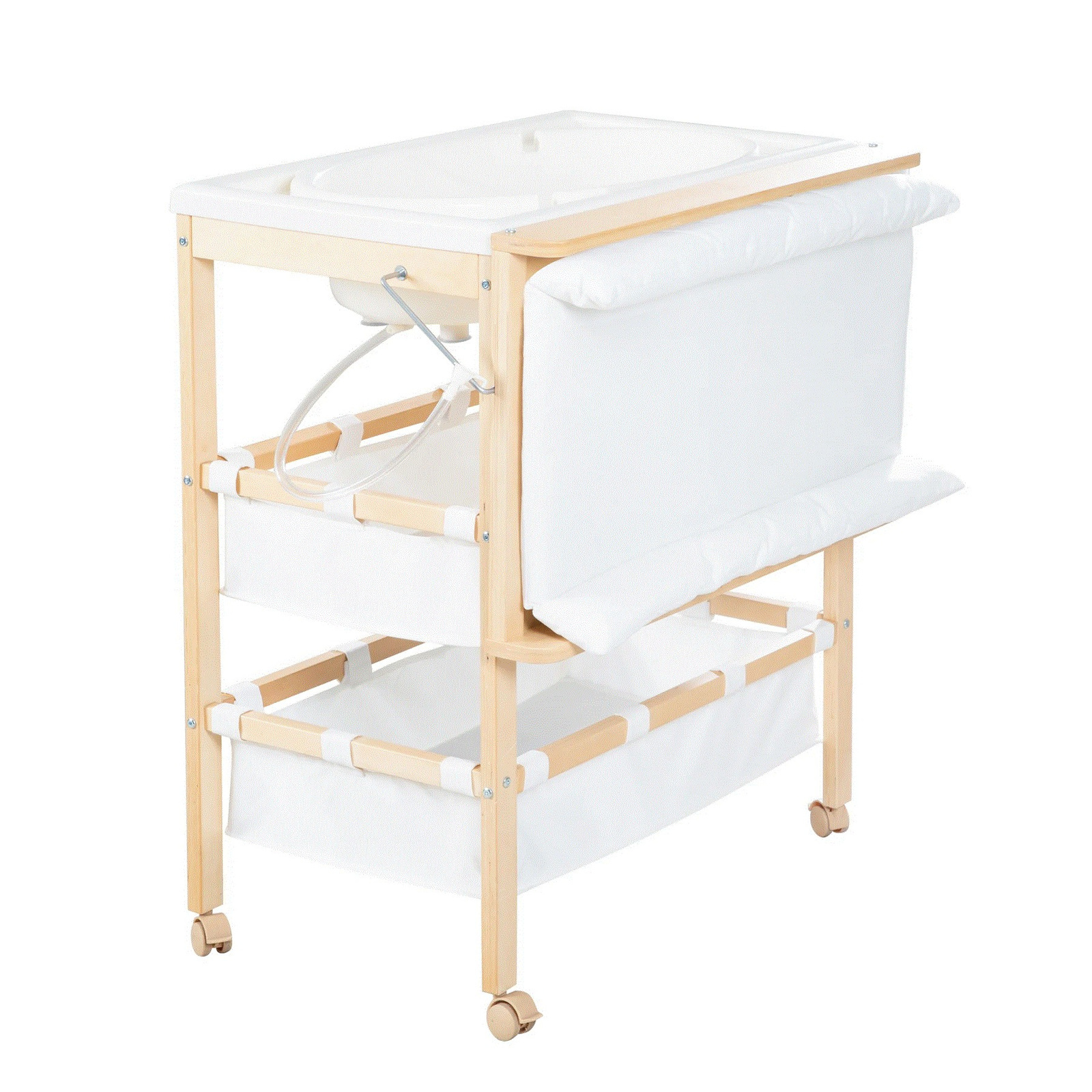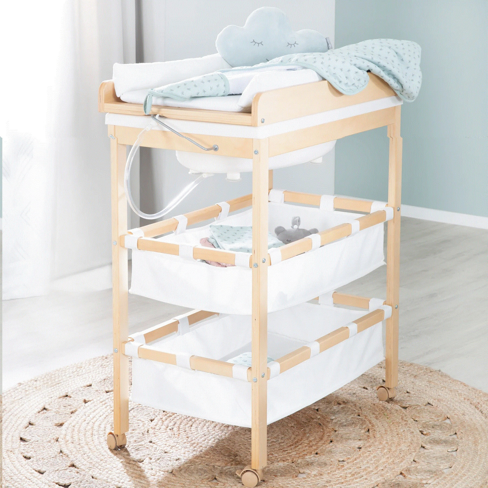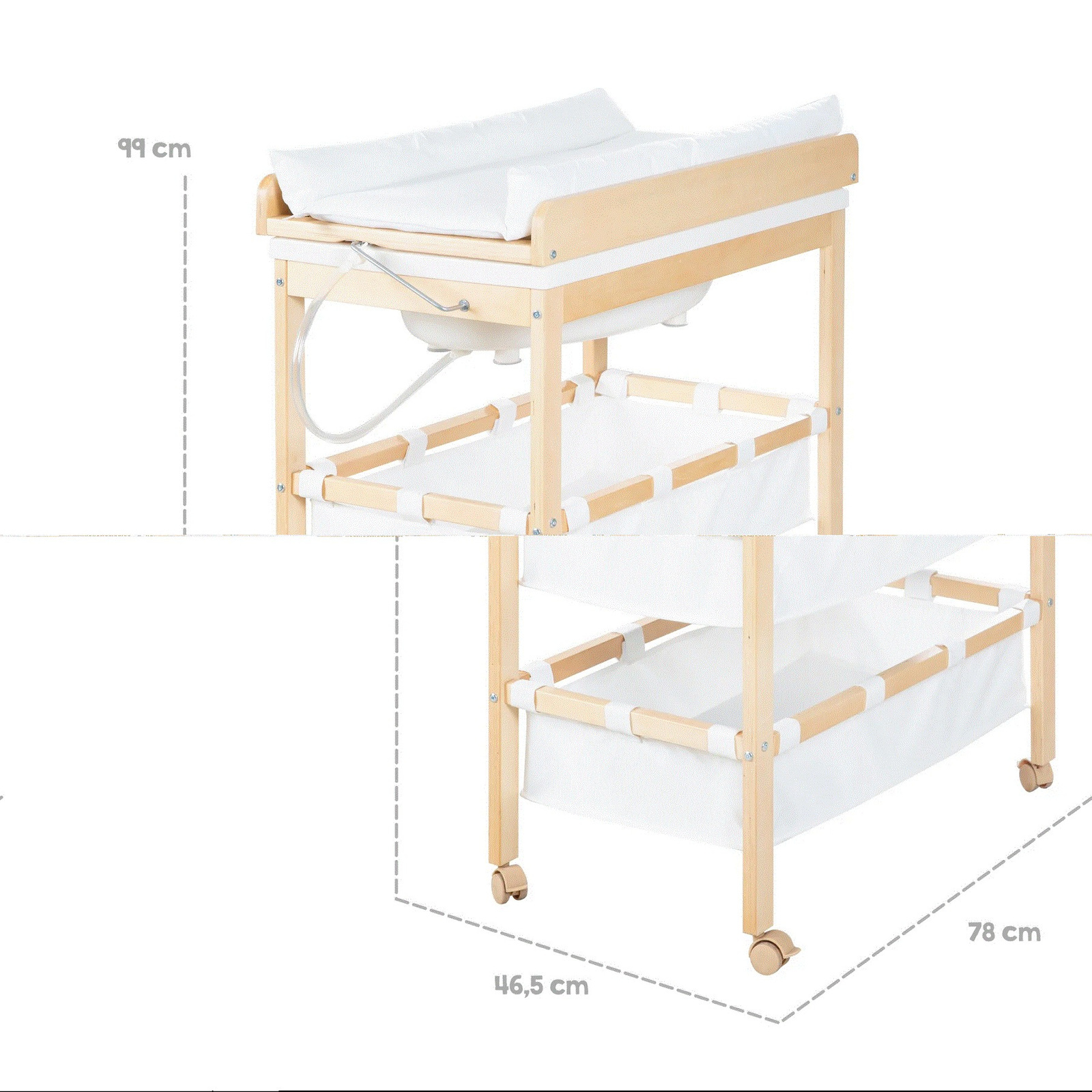 Regał do przewijania z wanienką roba może być przekształcony z przewijaka w stanowisko do pielęgnacji dziecka z wanną w jednym prostym kroku. Dzięki zintegrowanej wannie, kąpanie dziecka jest dziecinnie proste. Nie musisz się już schylać i jesteś bezpośrednio na tej samej wysokości co Twoje dziecko, które możesz bezpiecznie położyć na przewijaku obok wanny po kąpieli. Wąż odpływowy umożliwia łatwy odpływ wody bez konieczności przemieszczania wanny. Wygodna wysokość wynosząca 94 cm jest szczególnie przyjazna dla Twoich pleców. Łatwa w pielęgnacji i odporna na zużycie mata do przewijania z miękko wyściełanymi krawędziami zabezpieczającymi jest pokryta poliuretanem i dlatego jest bardzo wygodna i łatwa w pielęgnacji. Regał zawiera dwa schowki wykonane z wytrzymałego materiału płóciennego do przechowywania wszystkich niezbędnych przyborów do pielęgnacji niemowląt, potrzebnych do wymiany pieluch i kąpieli w zasięgu ręki. Wysuwana cześć regału posiada kółka z hamulcami, które umożliwiają łatwe przemieszczanie i stabilne ustawienie.