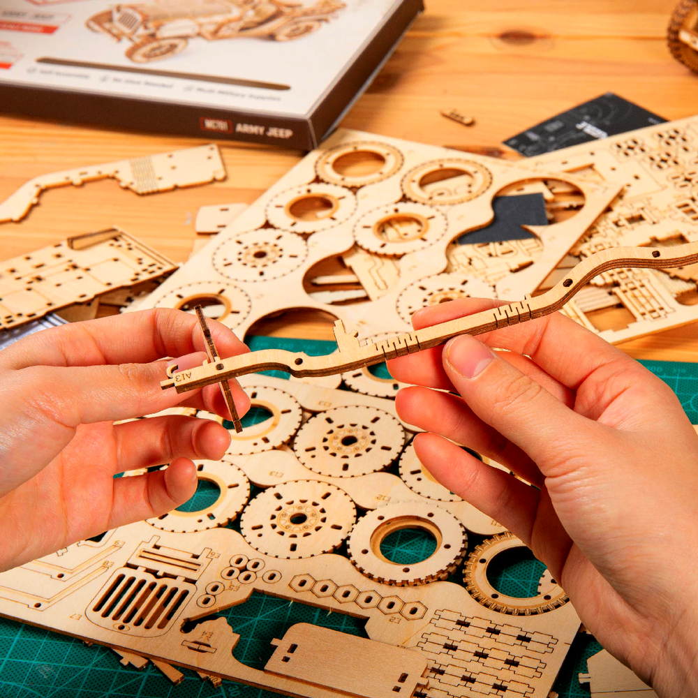 Drewniane puzzle 3D w kształcie pojazdu wojskowego Jeep, wykonane z wysokiej jakości sklejki. Zestawy mają postać arkuszy z wstępnie wyciętymi i ponumerowanymi elementami, które przed montażem należy oddzielić od wykroju, a następnie połączyć bez użycia klej, zgodnie ze szczegółową instrukcją dołączoną do opakowania. Dzięki wykorzystaniu nowoczesnej technologii obróbki drewna, model charakteryzuje duża ilość detali, a jego budowa jest ciekawym doświadczeniem (montaż wybranych elementów może wymagać użycia kleju do drewna- zestaw nie zawiera kleju).