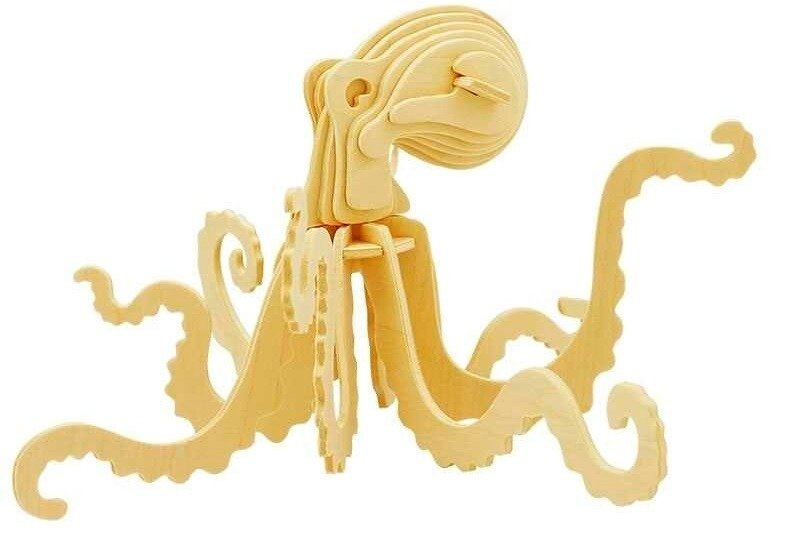 Drewniane puzzle 3D w kształcie ośmiornicy. Zestaw został wykonany z wysokiej jakości sklejki i jest w postaci arkuszy z wstępnie wyciętymi i ponumerowanymi elementami. Przed montażem należy oddzielić części od wykroju, a następnie połączyć bez użycia kleju, zgodnie ze szczegółową instrukcją dołączoną do opakowania. Zabawka edukacyjna, która po złożeniu może również służyć jako dekoracja. Uwaga- zestaw może zawierać małe elementy, podczas składania puzzli, dzieci muszą pozostać pod opieką dorosłych.