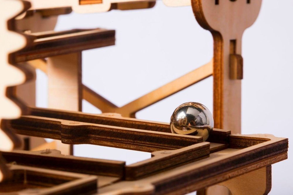 Zestaw do budowy drewnianego toru, na którym metalowe kulki pokonują różnorodne przeszkody. Model napędzany jest ręcznie, poprzez obrót mechanizmu korbowego. Zestaw został wykonany z wysokiej jakości sklejki i ma postać arkuszy z wstępnie wyciętymi i ponumerowanymi elementami, które przed montażem należy oddzielić od wykroju, a następnie połączyć bez użycia kleju, zgodnie z dołączoną instrukcją. Opakowanie zawiera 10 metalowych kulek.