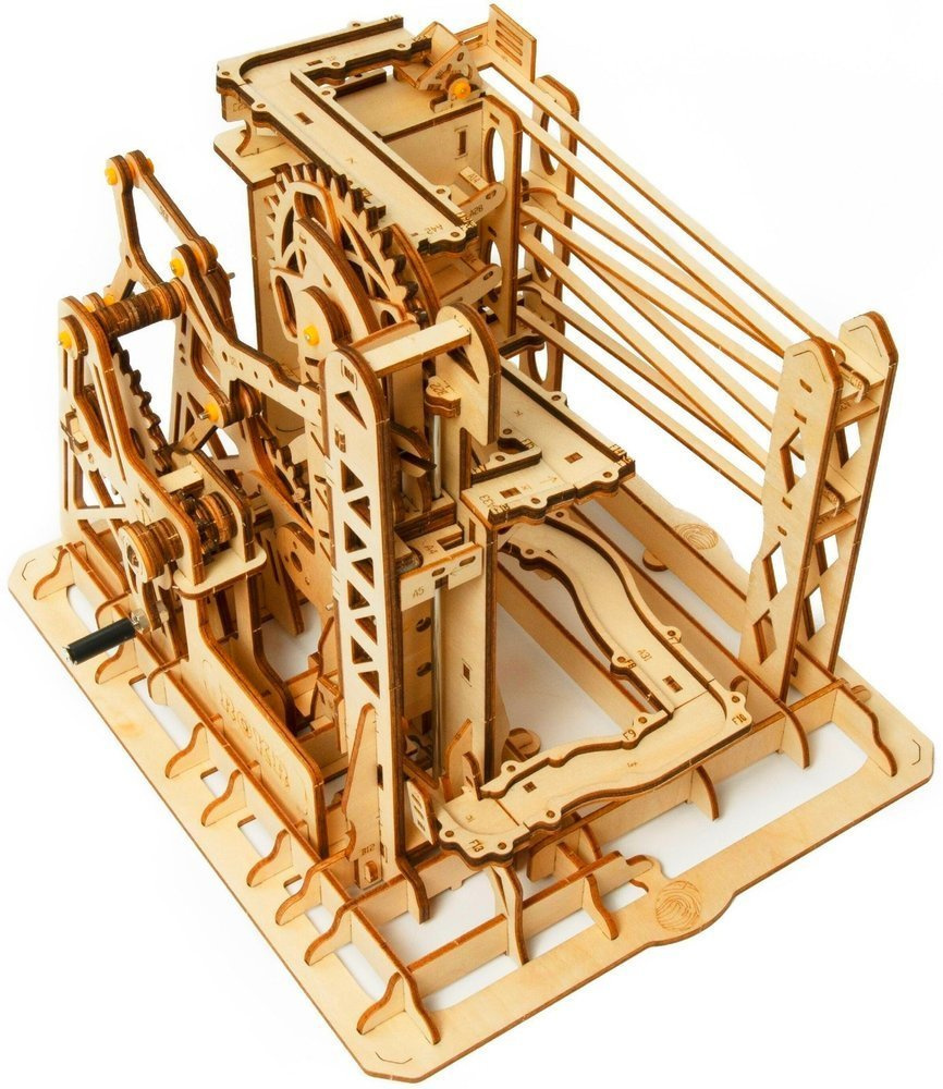 Zestaw do budowy drewnianego toru, na którym metalowe kulki pokonują różnorodne przeszkody. Model napędzany jest ręcznie, poprzez obrót mechanizmu korbowego. Zestaw został wykonany z wysokiej jakości sklejki i ma postać arkuszy z wstępnie wyciętymi i ponumerowanymi elementami, które przed montażem należy oddzielić od wykroju, a następnie połączyć bez użycia kleju, zgodnie z dołączoną instrukcją. Opakowanie zawiera 10 metalowych kulek.