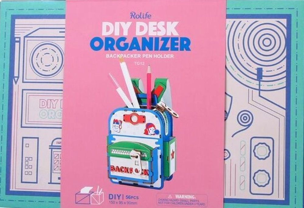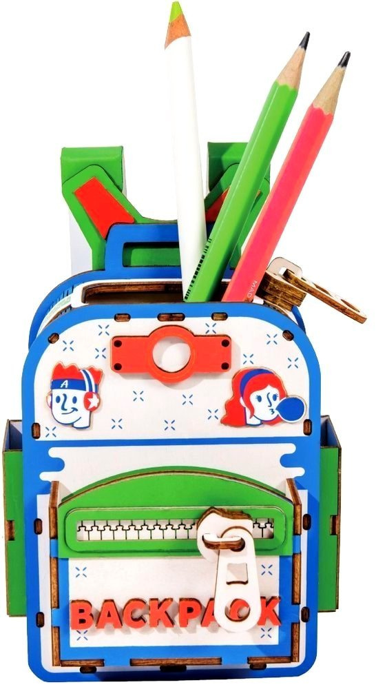 Kolorowy organizer w kształcie plecaka, który pomoże utrzymać ład i porządek na Twoim biurku. Zestaw został wykonany z wysokiej jakości sklejki i jest w postaci arkuszy z wstępnie wyciętymi i ponumerowanymi elementami. Przed montażem należy oddzielić części od wykroju, a następnie połączyć bez użycia kleju, zgodnie ze szczegółową instrukcją dołączoną do opakowania.