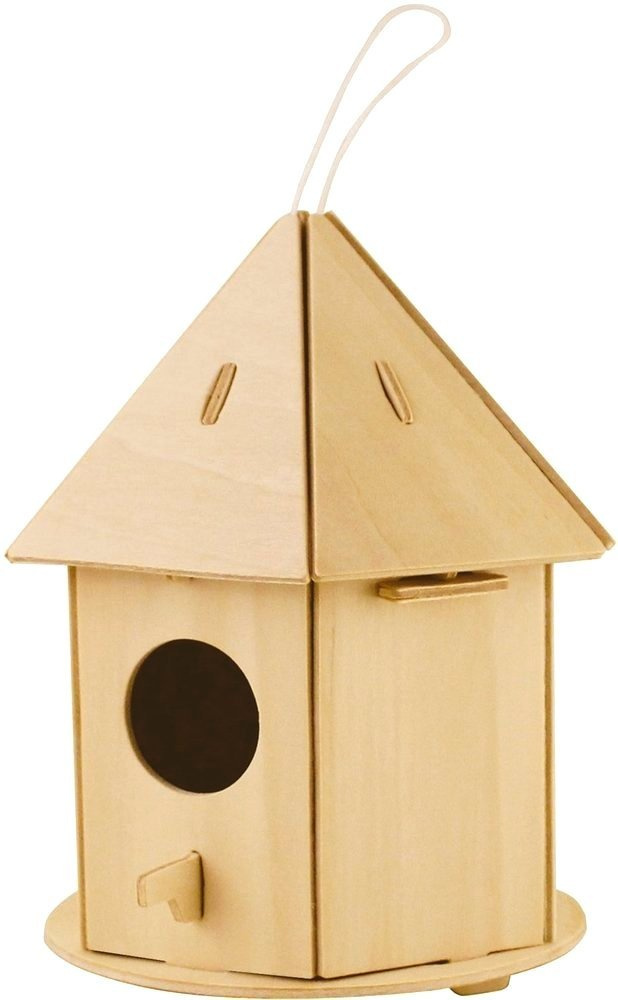 Seria drewnianych puzzli 3D składająca się z modeli karmników dla ptaków, które po złożeniu można pomalować.