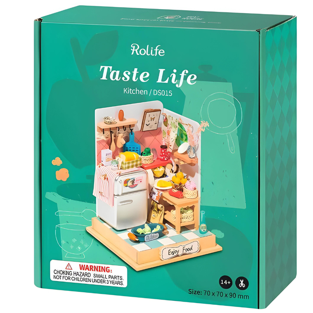 Zestaw umożliwiający złożenie miniaturowej kuchni. Do budowy modelu wykorzystano między innymi drewno, papier, tkaniny, drut, tworzywo sztuczne oraz różne elementy ozdobne takie jak: kolorowe cekiny, koraliki, sztuczne kwiaty oraz wiele innych materiałów. kuchnia jest ciekawie zaprojektowana, posiada wiele drobnych detali, a po złożeniu ma niewielkie rozmiary, dzięki czemu może pełnić rolę oryginalnej dekoracji. Opakowanie oprócz czytelnej, obrazkowej instrukcji zawiera także przezroczysty, bezwonny klej oraz pęsetę ułatwiającą montaż małych elementów. Budowa tego modelu pomoże rozwinąć zdolności manualne i przyniesie dużo satysfakcji.
