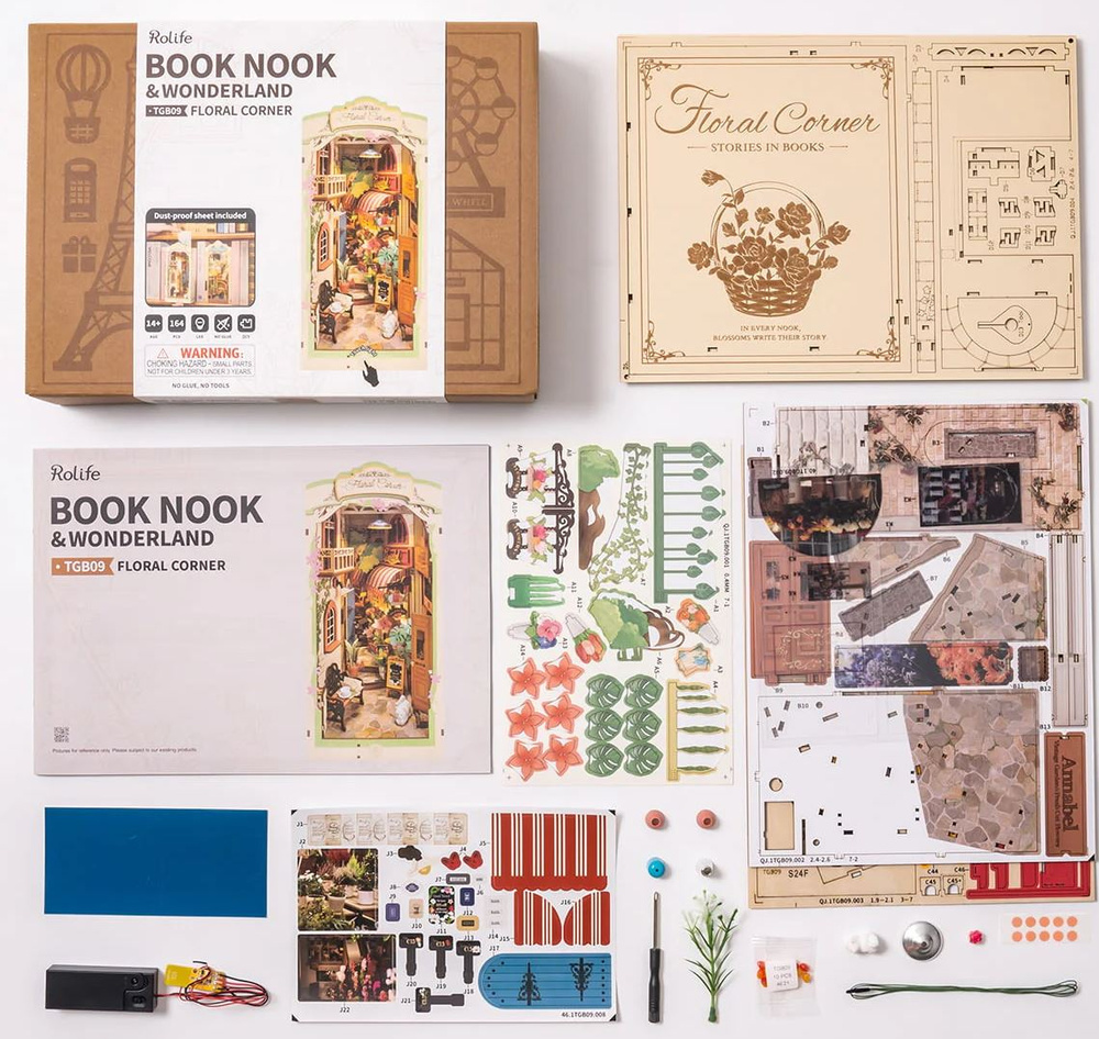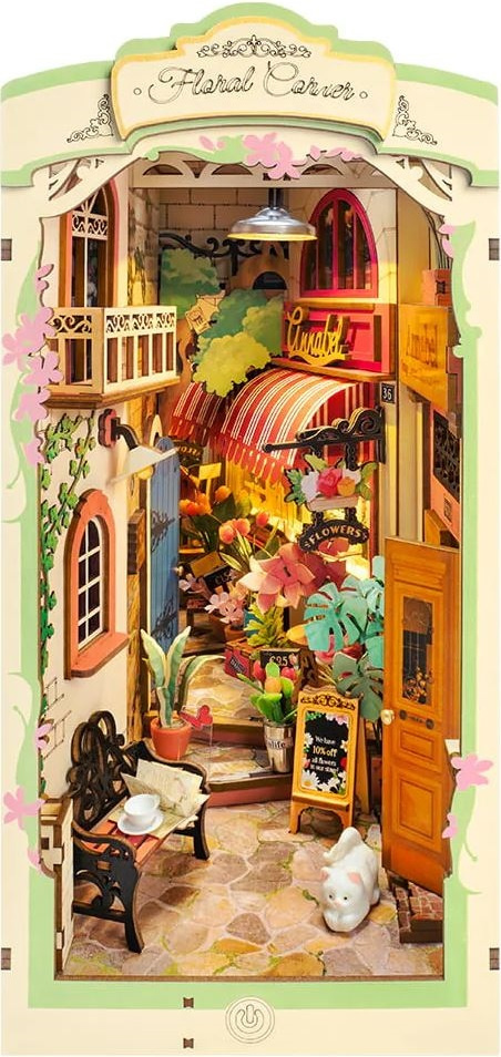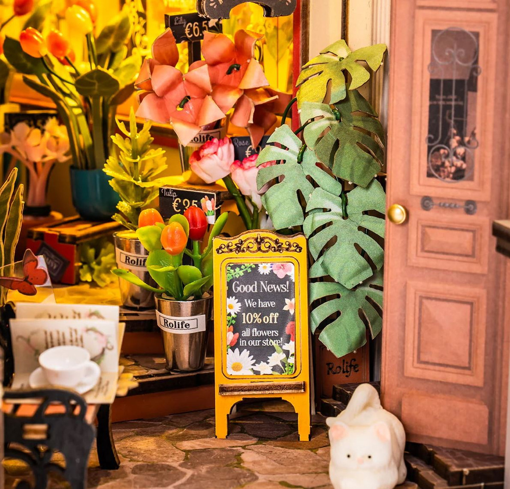 Zestaw umożliwiający złożenie miniaturowej kwiaciarni z oświetleniem LED. Do budowy modelu wykorzystano między innymi drewno, papier, tkaniny, drut, tworzywo sztuczne oraz różne elementy dekoracyjne takie jak: kolorowe ozdoby, cekiny, koraliki, sztuczne kwiaty oraz wiele innych materiałów. Dodatkowego uroku nadaje całości oświetlenie LED, dzięki któremu księgarnia może pełnić rolę nastrojowej dekoracji lub lampki nocnej. Opakowanie oprócz czytelnej, obrazkowej instrukcji zawiera także baterie, pędzelek, farby akrylowe, przezroczysty, bezwonny klej oraz pęsetę ułatwiającą montaż małych elementów. Budowa tego modelu pomoże rozwinąć zdolności manualne i przyniesie dużo satysfakcji.