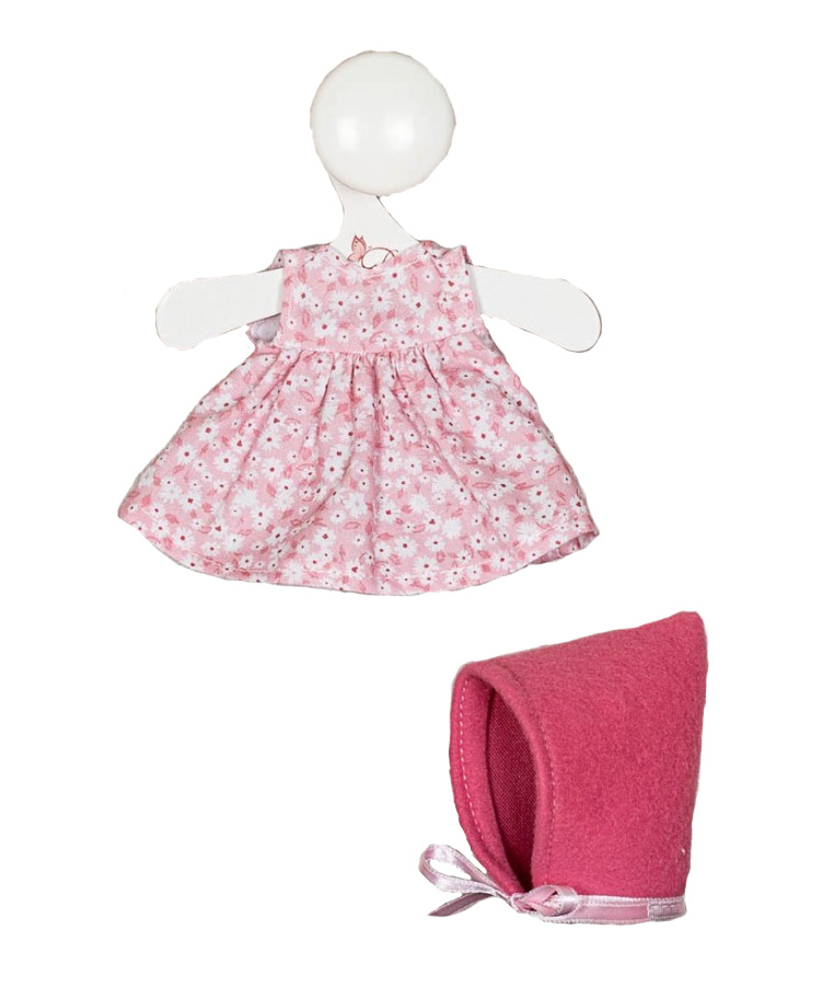 Różowa sukienka to kolejny dodatek pasujący dla bobasa o rozmiarze 20 cm. Zestaw uzupełnia garderobę ulubionej lali. Komplet zawiera sukienkę na szerokich ramiączkach zapinaną z tyłu na rzep. Odcinana w talii kreacja została ozdobiona printem w stokrotki. Dopełnieniem kompletu ubraniowego jest wiązana czapeczka wykonana z polaru.