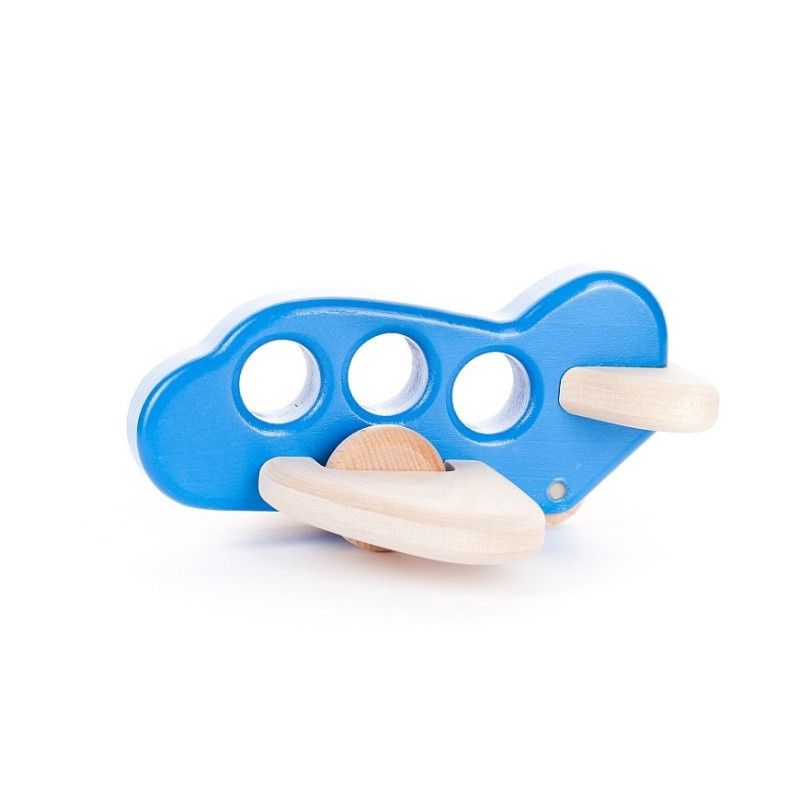 Samoloty! Duże i małe. Te, które lądują i te startujące. Kogo wozi samolot z trzema oknami? Przewozi pasażerów. Łatwo go rozpoznać, ponieważ jest większy od samolotów przystosowanych tylko na pilota. Natomiast trzy okna to uchwyt przystosowany dla małej rączki. Forma, miękkie kształty krzywizn i odpowiednio dobrane wielkości otworów, pozwalają dziecku odkrywać chwytność palców i rozpoznawać kształty. Każdy ruch zabawką– popychanie, toczenie, jeżdżenie po krzywiznach mebli, kreślenie linii w powietrzu jest równocześnie odkrywaniem przestrzeni i dynamizmu ukrytego w ciele. Zabawa samolotem rozwija zatem motorykę dużą.