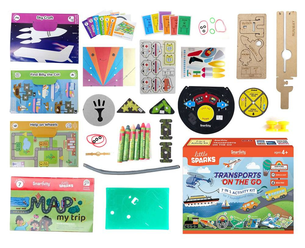 Jak latają samoloty, poruszają się samochody, a statki utrzymują się na powierzchni? Dowiedz się wszystkiego o systemach transportu powietrznego, wodnego i lądowego dzięki Smartivity Transports On The Go. Ten niesamowity zestaw do majsterkowania jest przeznaczony dla dzieci w wieku od 4 do 6 lat i zawiera ekscytujące gry, które pomagają dzieciom rozwijać podstawowe umiejętności.