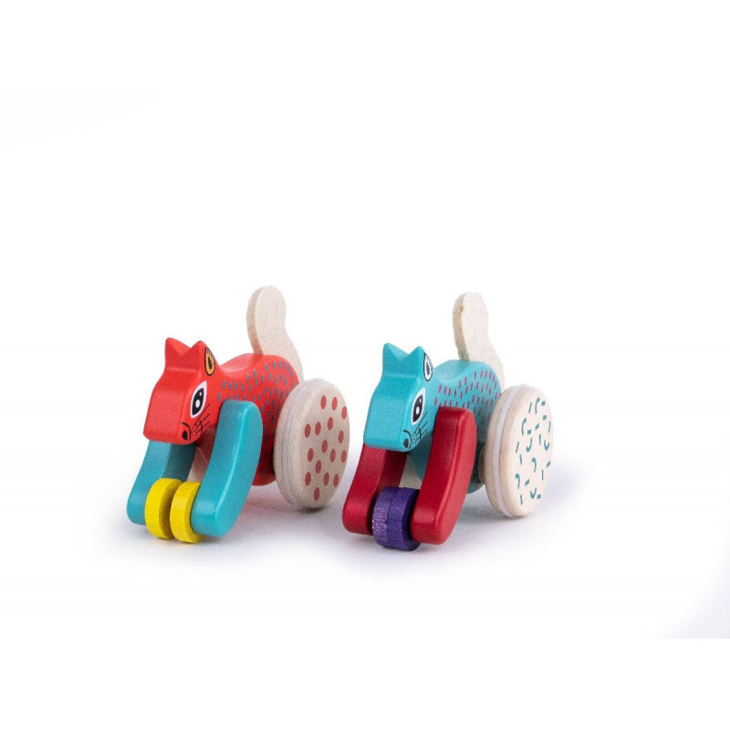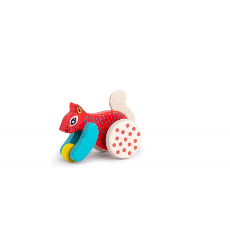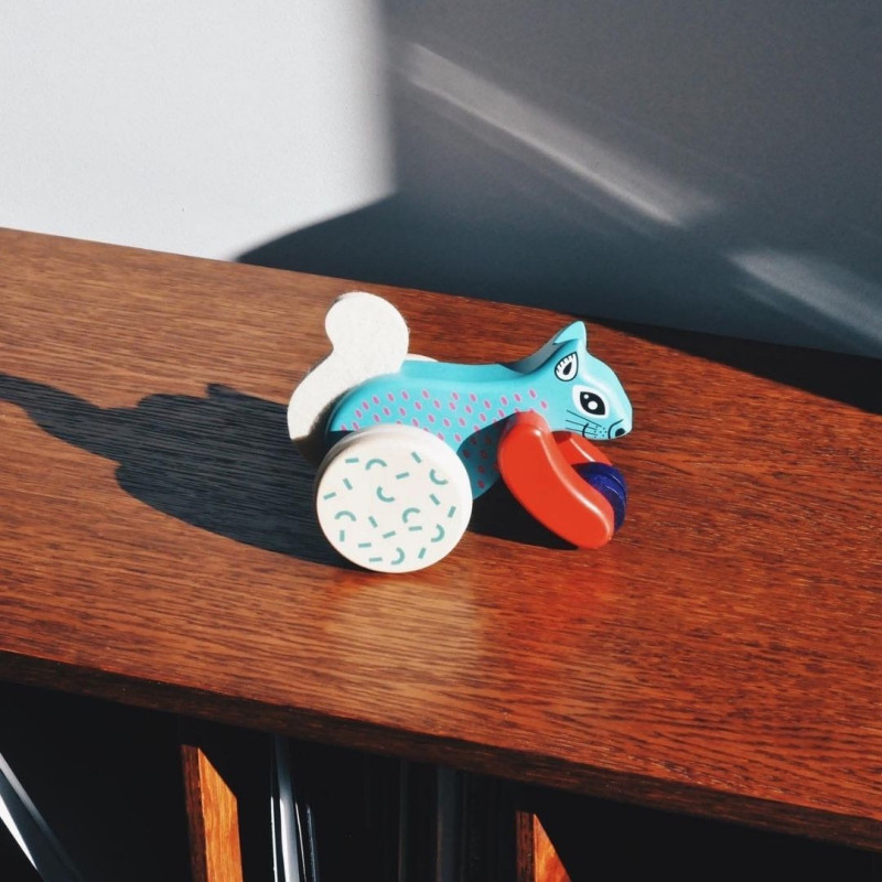 Podskakuje po popchnięciu, naśladując prawdziwe zwierzę. Posiada filcowy ogon i trzyma w dłoniach symboliczny orzech. Drewniana kicająca wiewiórka, posiada specjalny mechanizm, który wprawia zabawkę w ruch.