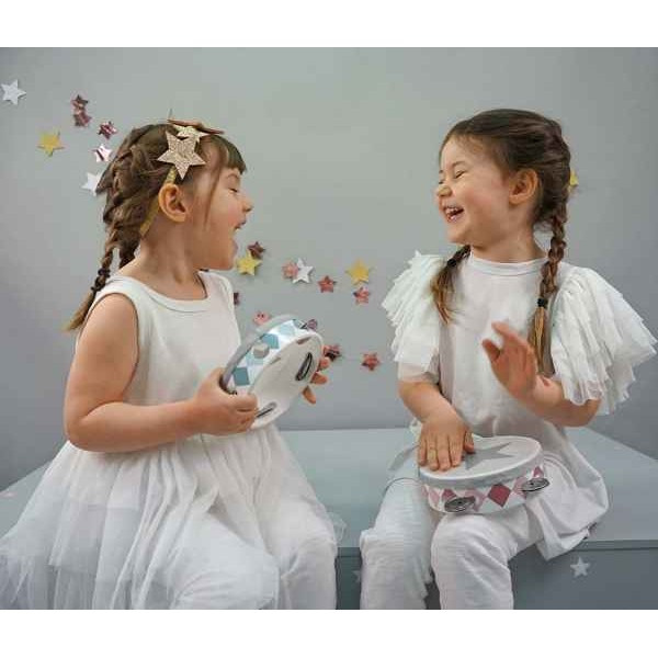 Bębenek i tamburyn połączone w jeden instrument. Zabawka może być używana zarówno jako tamburyn, jak i jako bębenek. Gwiazda na środku bębna dodaje całemu instrumentowi uroku