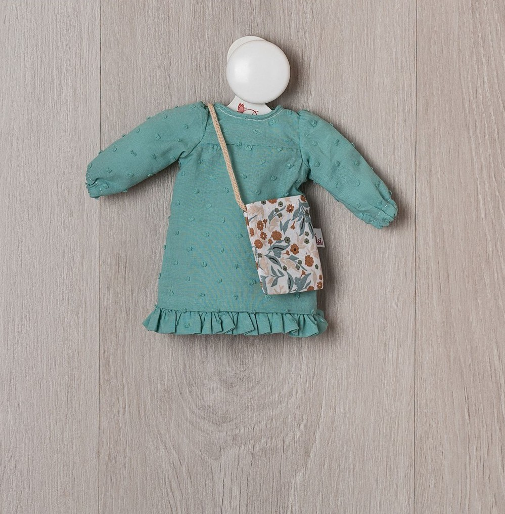 Zabawę lalkami uatrakcyjnia bogaty wybór ubranek. Wysokiej jakości, ręcznie szyta, stylowa sukienka została ręcznie uszyta z miękkiej bawełny w kolorze turkusowym. Dół zdobi urocza falbanka. Szyku dodaje materiałowa torebka w delikatny, roślinny wzór. Strój Idealnie pasuje na hiszpańskie lalki z popularnej serii ASI Celia.