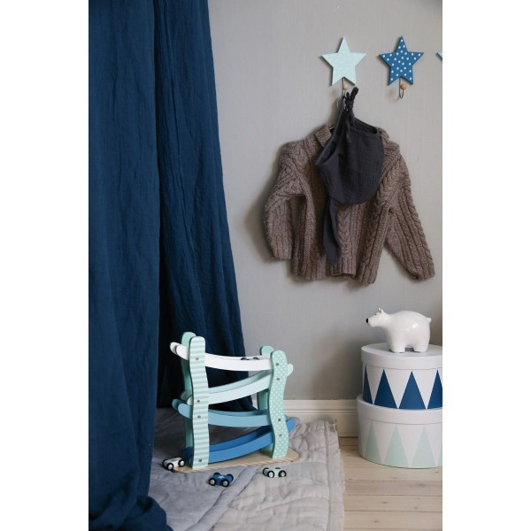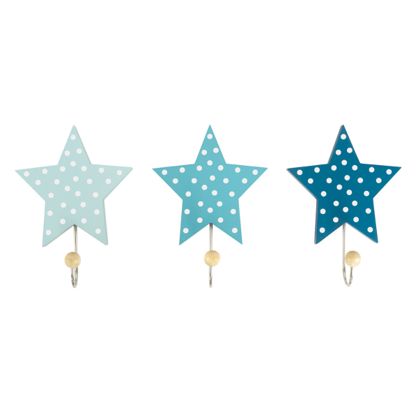 Uroczy zestaw trzech drewnianych wieszaków gwiazdka w kolorze niebieskim, szwedzkej marki Jabadabado - idealnie wkomponuje się w wystrój pokoju Twojego dziecka. Każdy wieszak w innym odcieniu niebieskiego. Ułatwi zapanowanie nad chaosem wśród ubrań, i nauczy malucha samodzielności w dbaniu o porządek w pokoju. Stanowić będzie świetny dodatek dekoracyjny, pasującvy idelanie do pozostałych akcesoriów wyposażenia dziecięcego pokoju w tej samej kolorystyce takich jak baldachim , pudełka czy walizki.  Wymiary: 16 cm
