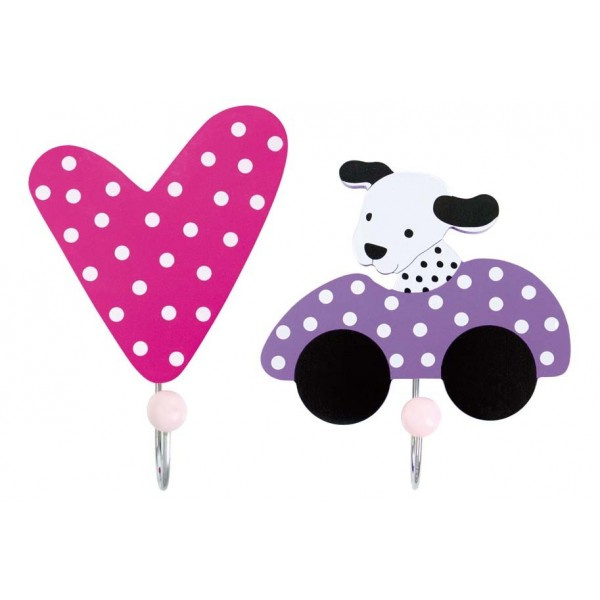 - Wieszak różowy pies to uroczy zestaw dwóch wieszaków szwedzkiej marki Jabadabado. Jeden wieszak z zabawnym wizerunkiem psa w fioletowej kolorystyce w białe kropki, drugi wieszak w kształcie gwiazdki w różu. Wieszak idealnie wkomponuje się w wystrój pokoju