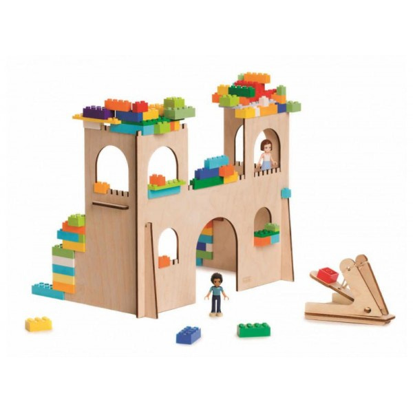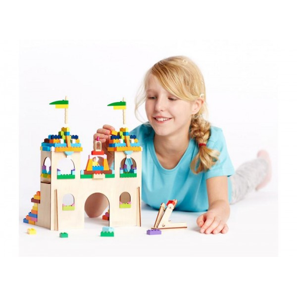 Zamek z katapultą to idealny zestaw dla małych twórców od holenderskiej marki BRIKKON - pozwoli stworzyć własną wspaniałą budowlę przy użyciu drewnianych elementów, klocków i odrobiny wyobraźni. Ten zestaw daje nieskończoną liczbę możliwości tworzenia własnych historii i projektowania własnych budowli, za każdym razem budowla może być inna większa i piękniejsza. Zestaw idealny zarówno dla dziewczynek, jak i chłopców - można wybudować niejeden zamek prawdziwej księżniczki, lub stworzyć zamek obronny, którego nie pokona nikt dzięki katapulcie.