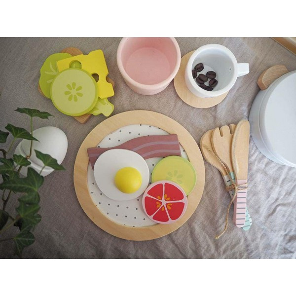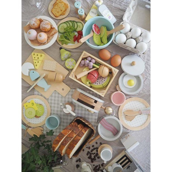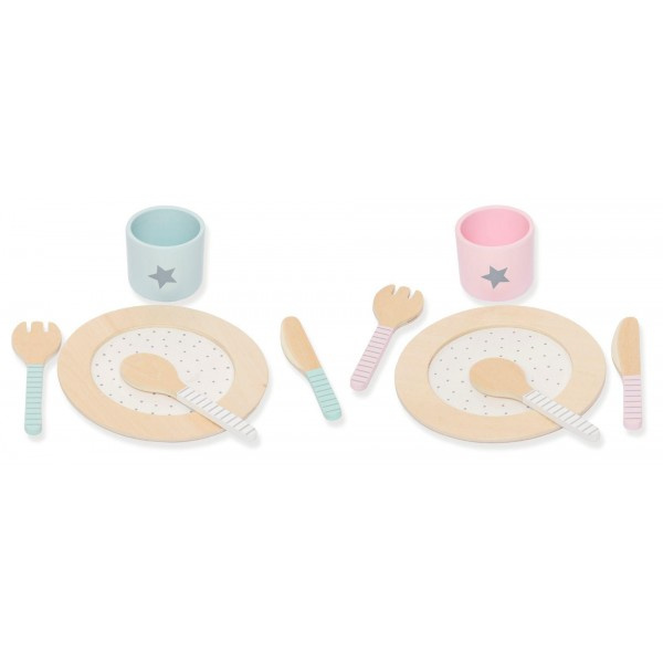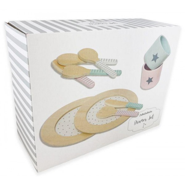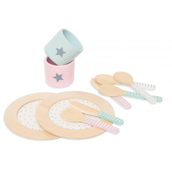 Drewniany zestaw obiadowy, serwis obiadowy skandynawskiej marki Jabdabado do idealne uzupełnienie kuchni dziecięcej. Najlepszą formą rozwoju i nauki u dzieci jest zabawa, dlatego bawiące się dzieci najlepiej chłoną wiedzę z radosnej zabawy. Skandynawskie akcesoria kuchenne marki Jabadabado spełniają nie tylko funkcję fajnej zabawki ale także uczą, rozwijają zdolności manualne, a także kreują wyobraźnie od najmłodszych lat. Ten śliczny zestaw obiadowy w pastelowej kolorystyce, idealnie będzie pasował na stole i pięknie zaprezentuje posiłęk młodego kucharza. W zestawie: dwa talerze w kolorystyce naturalnego drewna, połaczonej z klasyczną bielą i delikatnymi kropeczkami, zestaw sztućców -dwie łyzki, dwa noze i dwa widelce, oraz dwa kubeczki niebieski i rózowy z srebnymi gwiazdkami.