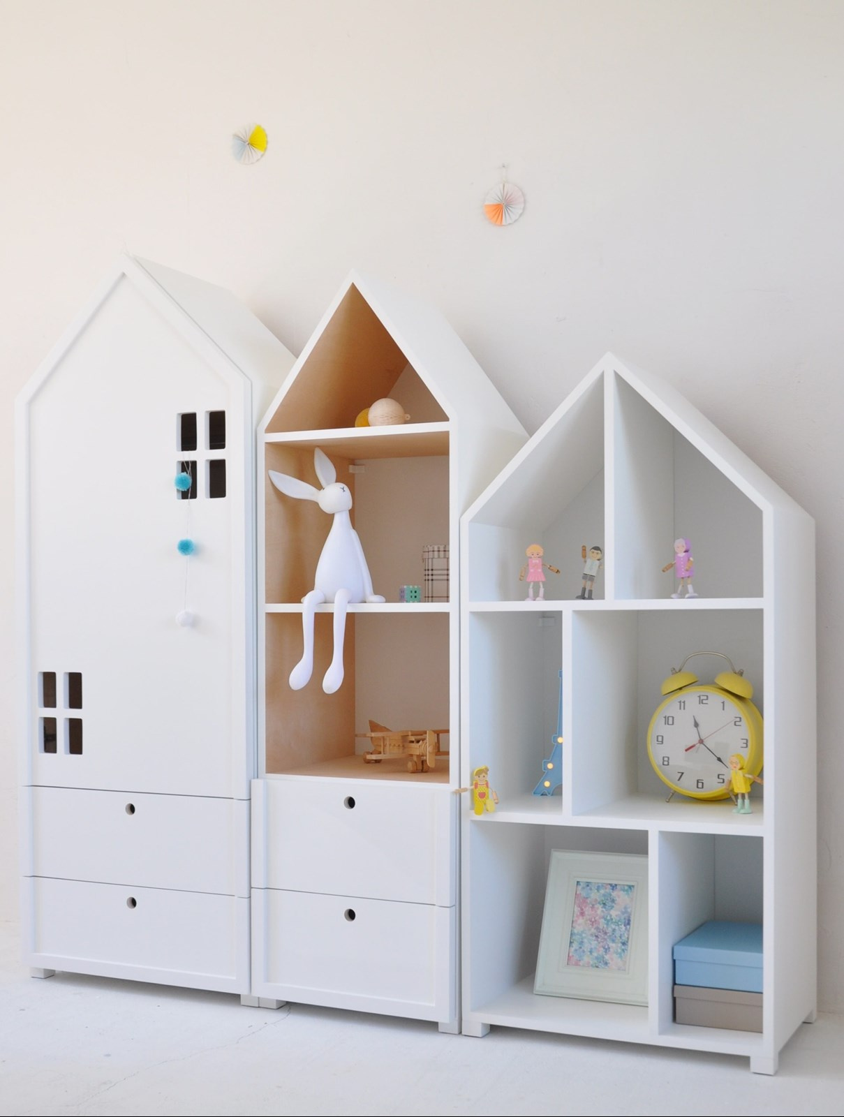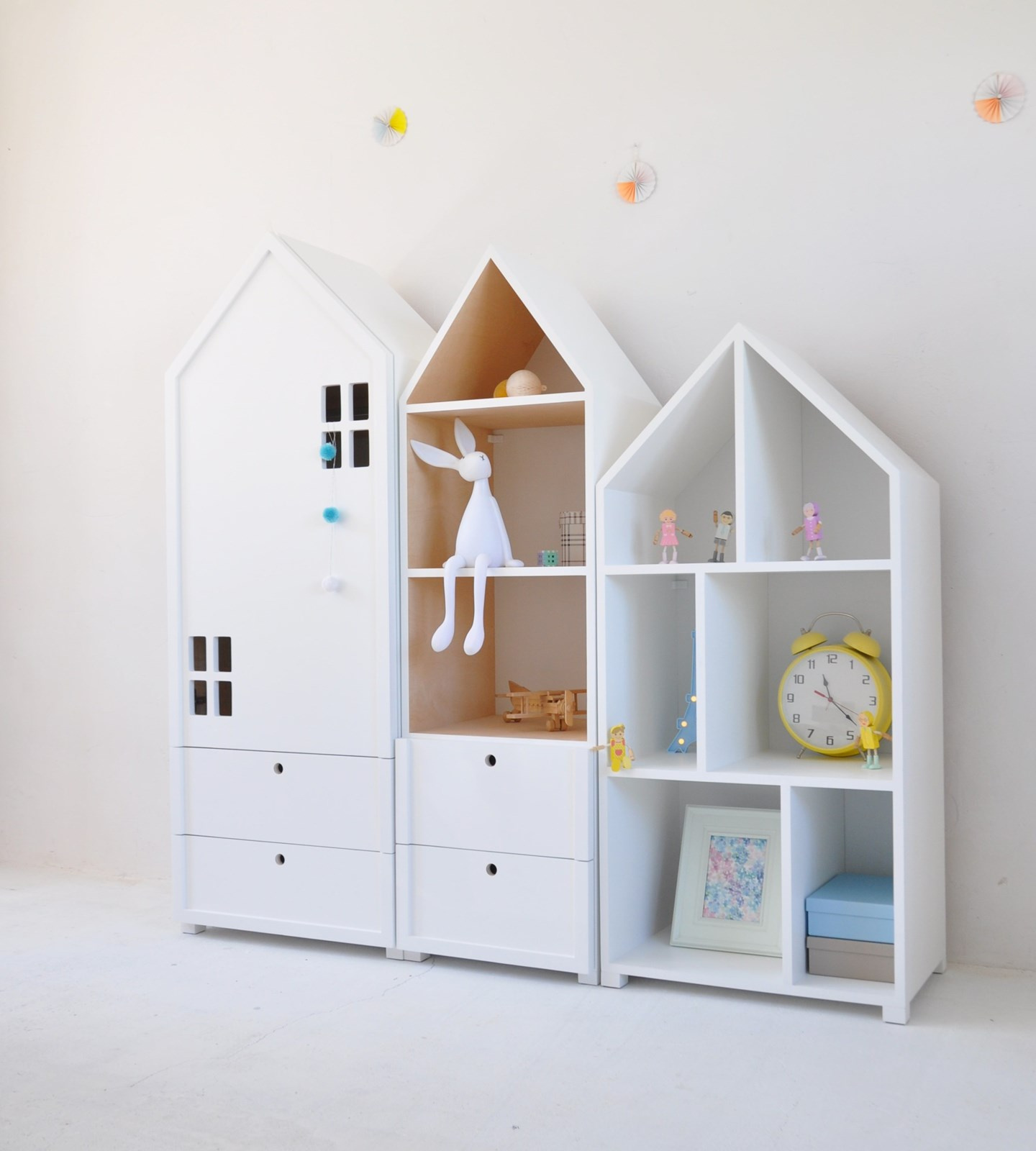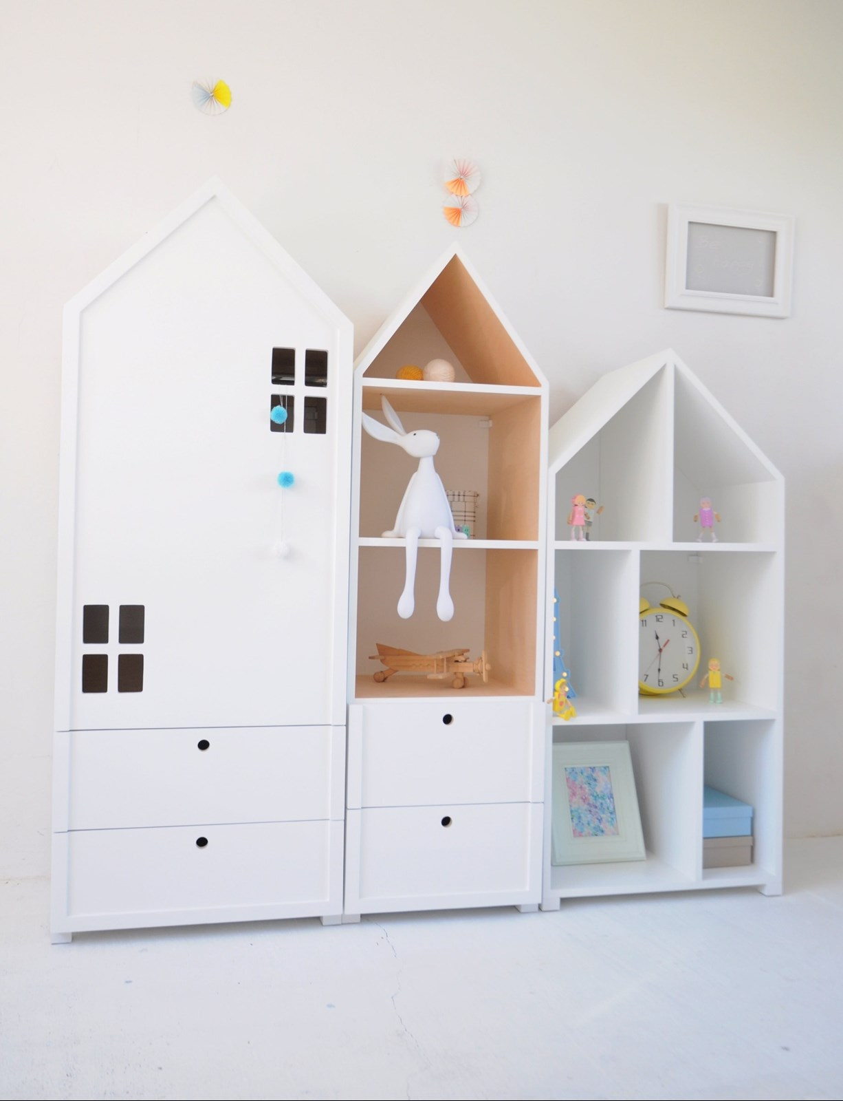 Zestaw mebli dziecięcych składający się z dwóch pojemnych regałów, oraz szafy w kształcie domków.