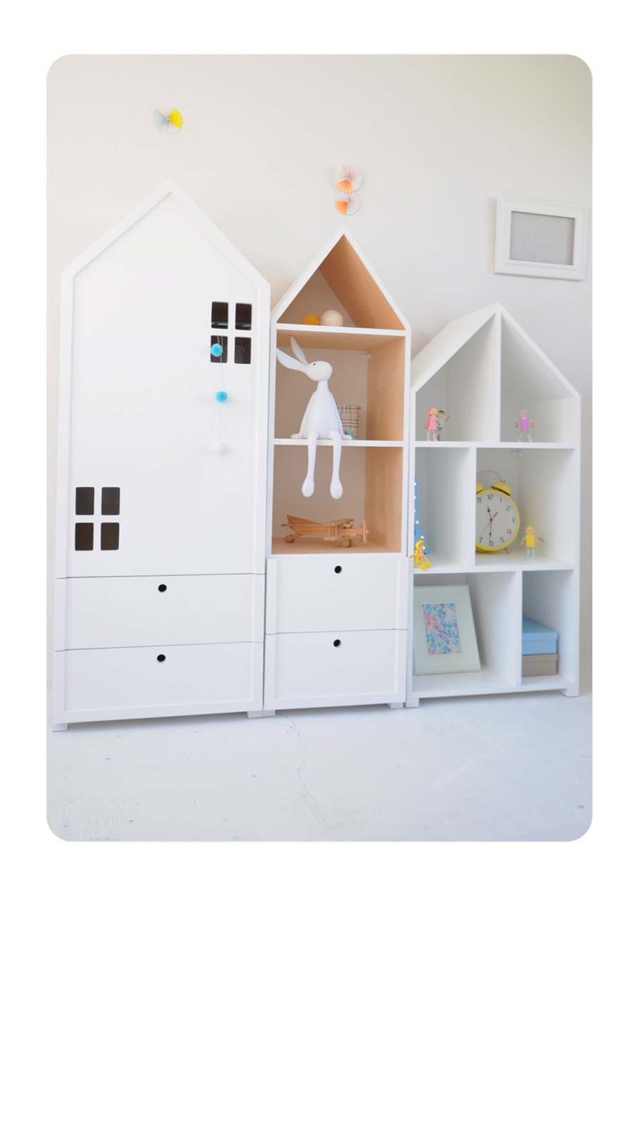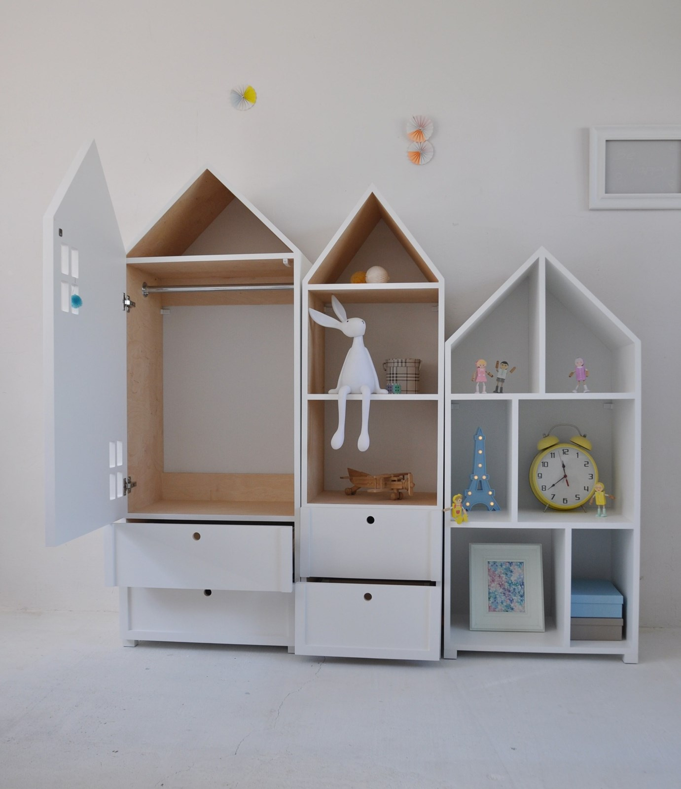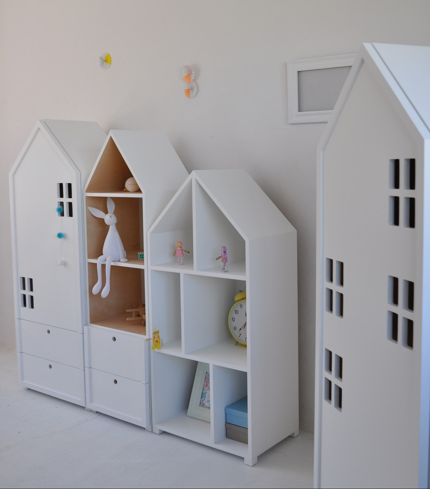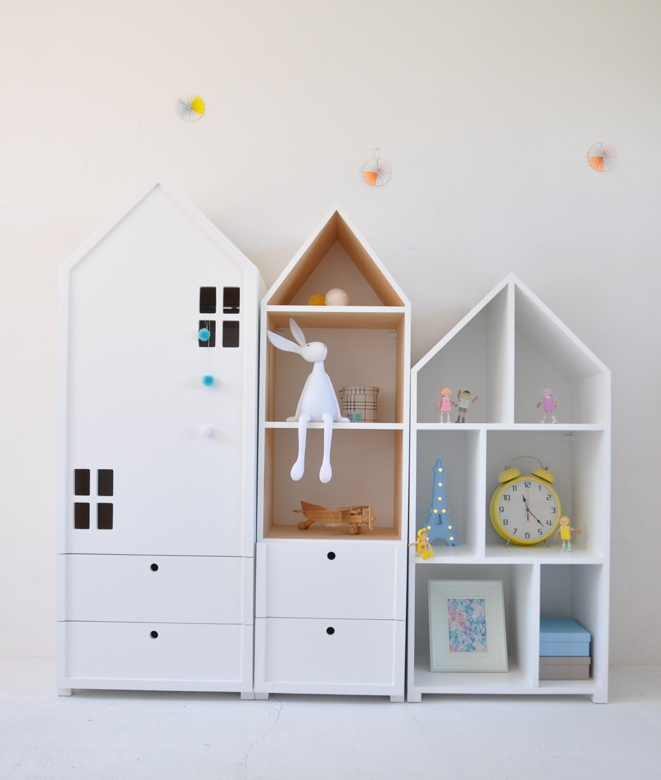 Zestaw mebli dziecięcych składający się z dwóch pojemnych regałów, oraz szafy w kształcie domków.