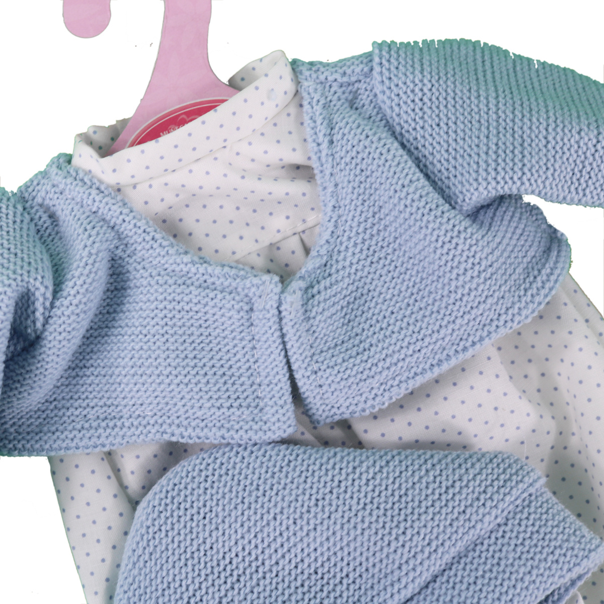 Zestaw ubranek został ręcznie uszyty w Hiszpanii i zaprojektowany dla bobasów o wysokości 33-34 cm.
