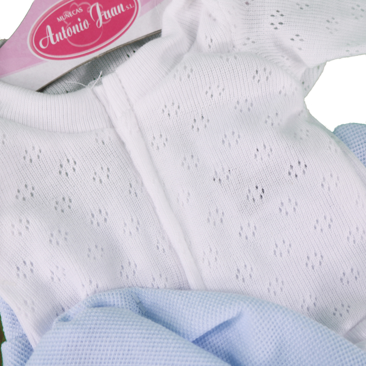 Zestaw wysokiej jakości miękkich ubranek dla bobasa o wysokości 33-34 cm został uszyty ręcznie i zaprojektowany w Hiszpanii.