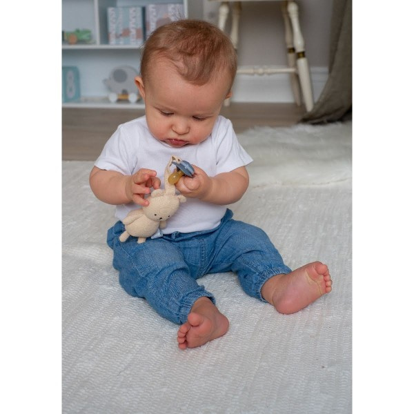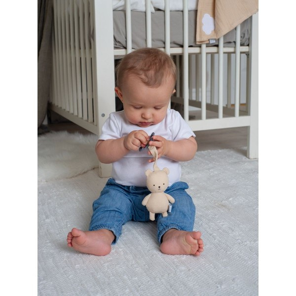 Kocyk, otulacz wykonany jest z 100% z bawełny organicznej w kolorystyce naturalnego beżu, wyśmienicie komponuje się z przyjacielem smoczka uroczym misiem w tej samej kolorystyce.